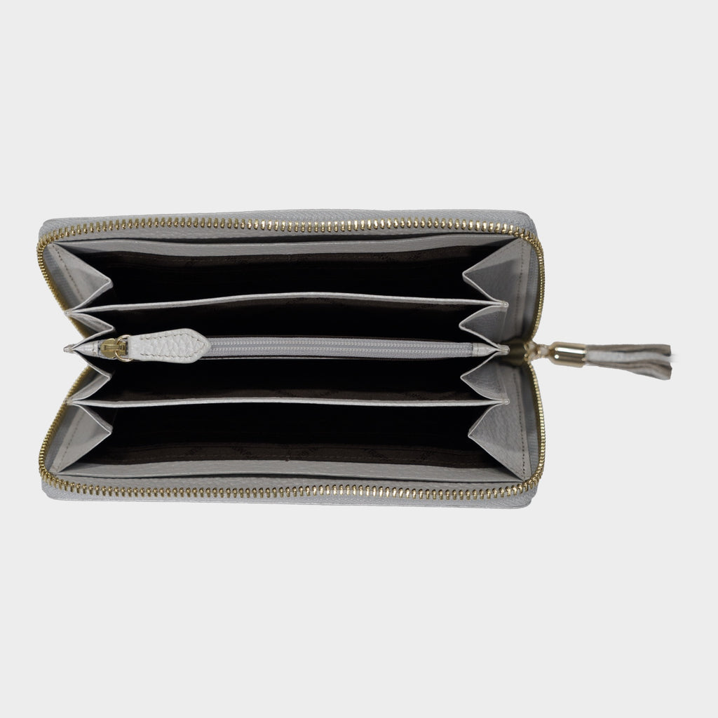 Die ALESSIA-Börse in länglichem Zip-Format besticht durch ihr genarbtes, weiches Leder in edlem Silber-Grau mit dezentem Metallicschimmer und liegt angenehm in der Hand. Sie bietet großzügigen Stauraum und vereint zeitlose Eleganz mit modernen Details. Goldene Akzente, wie das Logo-Emblem und die Innenprägung, sowie der stilvolle Reißverschluss-Anfasser mit femininer Quaste verleihen ihr eine exklusive Ausstrahlung. Das hochwertige Logo-Jacquard-Innenfutter unterstreicht das durchdachte Design. Die Innenaufteilung umfasst drei Hauptfächer für Scheine und Dokumente, ein Münzfach mit Reißverschluss, drei Steckfächer und achtzehn Kreditkartenfächer. Ein zusätzliches rückwärtiges Steckfach sorgt für schnellen Zugriff auf das Wichtigste. Diese Börse ist der ideale Begleiter für alle Frauen, die im Alltag ein modisches Statement setzen wollen.