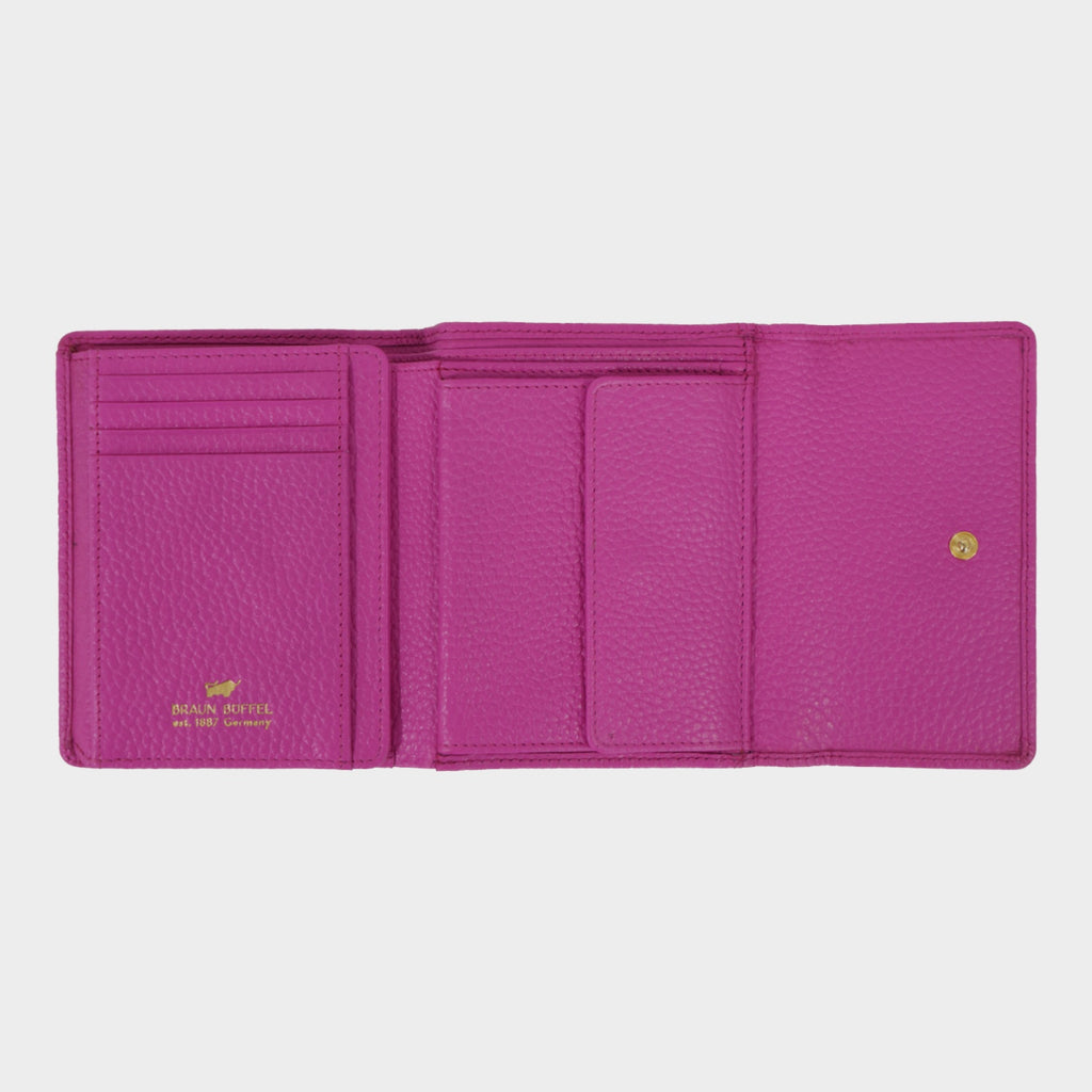 Die ASTI-Geldbörse gefertigt aus weichem, hochwertigem feingenarbtem Leder in einem sommerlich-leuchtenden Fuchsia-Ton, bietet mit ihrem mittelgroßen Format viel Platz und Flexibilität. Der Überschlag ist mit zwei Druckknöpfen anpassbar und sorgt damit stets für einen sicheren Verschluss je nach Inhaltmenge. Mit einem goldenen Logo-Metallteil und einer goldenen Innenprägung setzt sie elegante Akzente. Nach dem Öffnen lässt sie sich noch zweifach ausklappen und bietet optimalen Zugriff auf zwei Scheinfächer, acht Kartenfächer, sechs Steckfächer sowie ein Münzfach mit Überschlagklappe. Ein großes Netz-Sichtfach eignet sich ideal für Ausweise oder Tickets. Das rückwärtige Steckfach ermöglicht schnellen Zugriff auf das Wichtigste. Modern umgesetzt und mit RFID-Schutz ausgestattet, schützt sie Ihre Daten zuverlässig. Diese zeitlose, alltagstaugliche Geldbörse ist perfekt für Damen und junge Frauen, die Wert auf stilvolles Design und hohe Funktionalität legen.