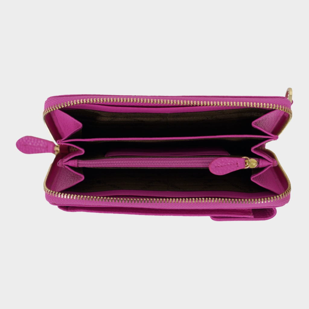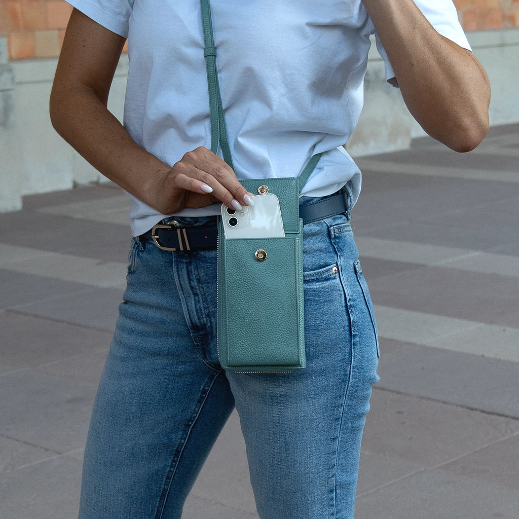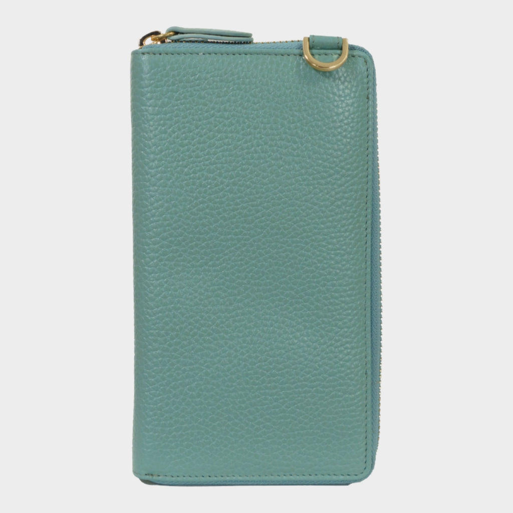 Die ASTI-Börse in länglichem Zip-Format aus weichem, feingenarbtem Leder in sanftem, frischem Mistelgrünkombiniert klassische Eleganz mit modernen Akzenten. Sie bietet großzügigen Stauraum und verfügt auf der Front über ein separates, integriertes Handyfach für die gängigen Größen mit Überschlag und Magnetverschluss. Dank des abnehmbaren, verstellbaren Schultergurts lässt sich die Börse auch perfekt als kleine Tasche zum Umhängen nutzen. Goldene Metallteile, wie das Logo-Emblem, die goldene Innenprägung sowie der formschöne Reißverschluss-Anfasser verleihen der Börse eine edle Note. Mit RFID-Schutz ausgestattet, garantiert sie Sicherheit im Alltag. Das hochwertige Logofutter rundet das durchdachte Design ab. Die clevere Innenaufteilung umfasst drei Hauptfächer für Scheine, Belege und Dokumente, ein Münzfach mit Reißverschluss, zwei große Steckfächer sowie achtzehn Kreditkartenfächer. Ideal für Damen und junge Frauen, die eine stilvolle und funktionale Lösung für den Alltag suchen.