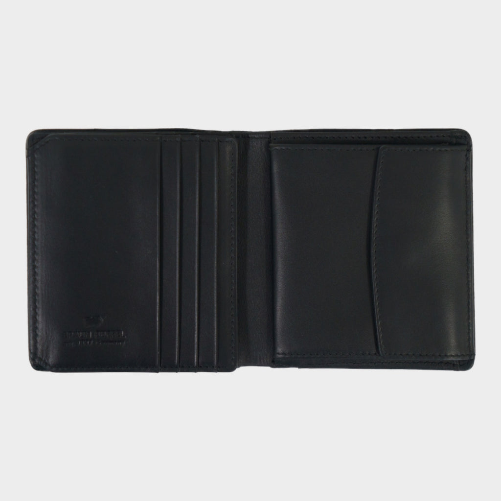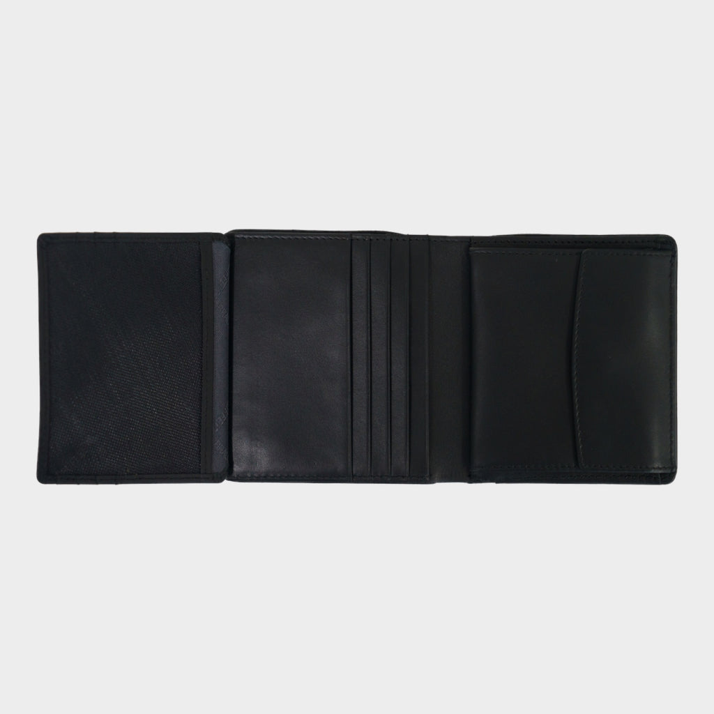 The BEN wallet in a handy square format combines a compact size with maximum organization – ideal for the modern man who appreciates both function and style. The exterior is crafted from elegant, naturally grained cowhide leather with a fine, all-around piping in black smooth leather and a silver-tone logo emblem. Inside, black smooth leather combined with an anthracite jacquard logo lining provides a premium finish. The vertical interior layout offers thoughtful organization: a flap that opens to the left reveals four card slots and a transparent mesh ID pocket, below which are four more card slots and a slip pocket. A coin pocket with a flap and snap closure, another slip pocket below, and two bill compartments complete the design. Integrated RFID protection reliably safeguards cards from unauthorized scanning – compact, elegant, and secure for everyday use.