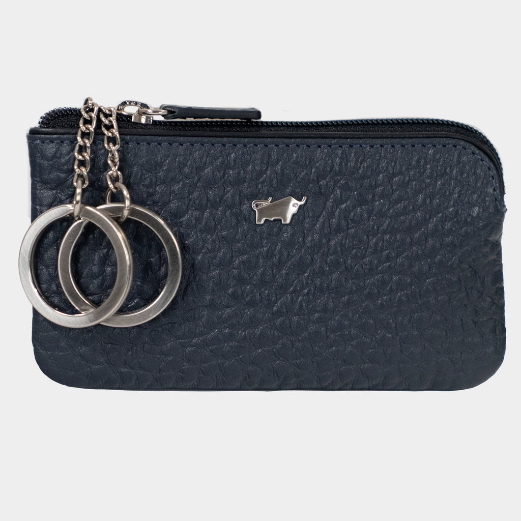 The BEN key case combines stylish aesthetics with practical function – a compact accessory for the modern man. Crafted from a combination of high-quality, naturally grained cowhide leather in dark blue on the front and smooth black leather on the back, it creates a striking interplay of contrasts. The mix of matte and subtly glossy surfaces and silver-tone metal hardware lends the case a stylish, urban touch. The zippered main compartment is lined with anthracite jacquard logo and houses two key rings on delicate chains – secure yet organized. An additional zippered pocket on the back provides space for coins or other small essentials. The silver-tone logo emblem on the front adds a sophisticated accent and perfectly completes the design.