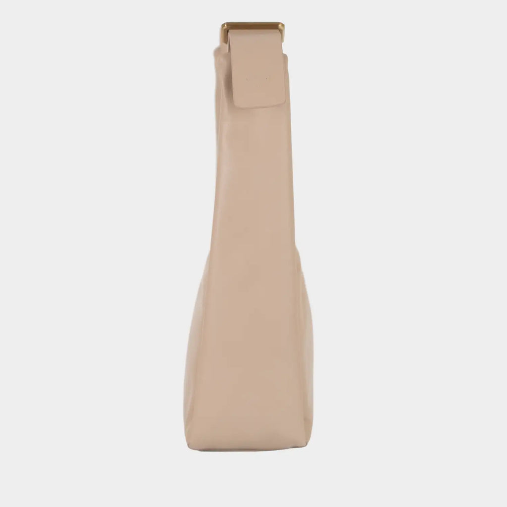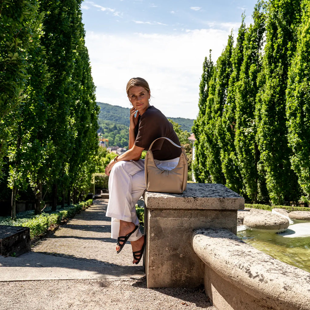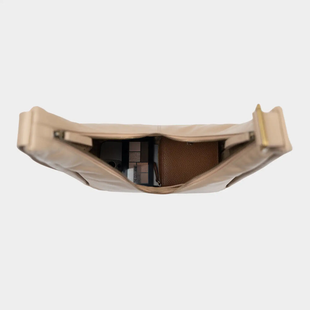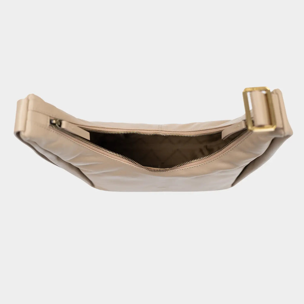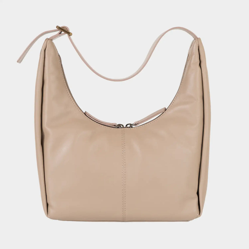 Die elegante Lotta Schultertasche besticht durch ihre moderne, schlanke Hobo-Form und ihre klare, reduzierte Silhouette. Das hochwertige, glatte Rindleder in einem warmen Sandton mit sanftem Glanz zeigt sich durch seine weiche Haptik besonders geschmeidig und anpassungsfähig und verleiht der Tasche eine angenehme, körpernahe Tragbarkeit. Ein auffälliges Merkmal ist der geschwungene, goldfarbene Reißverschluss, der sich über die Oberkante zieht und die dynamische Linienführung der Tasche betont. Die seitlichen Nähte sind leicht eingeschlagen, was der Tasche Volumen verleiht, ohne ihre Form zu überladen. Die Innenausstattung bietet mit zwei Steckfächern und einem Reißverschluss eine übersichtliche Organisation. Das sandfarbene Futter setzt einen edlen, hellen Akzent, der stilvoll mit dem dunklen Leder kontrastiert und die präzise Verarbeitung unterstreicht. Der breite, flache Tragegriff ist durch einen dekorativen Metallring verstellbar und lässt sich bequem über der Schulter tragen. Dezente Details wie die tonale Logoprägung auf der Vorderseite und am Ende des Schulterriemens, sowie die goldenen Beschläge ergänzen den hochwertigen Gesamteindruck. Ein minimalistisch-edler Begleiter für die moderne Frau im urbanen Alltag.