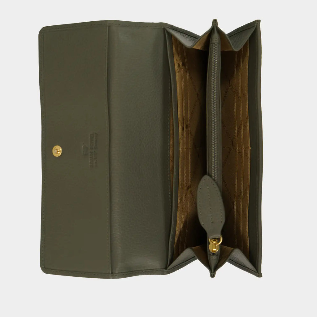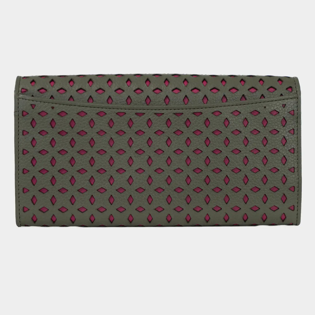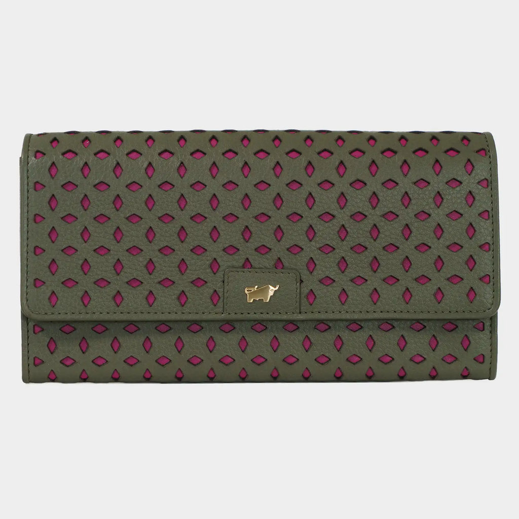 Die STELLA-Geldbörse im länglichen Format kombiniert gekonnt mediterrane Leichtigkeit mit urbanem Chic und überzeugt durch ihre elegante Linienführung. Gefertigt aus weichem, olivgrünem Rindleder mit feiner Narbung, begeistert sie mit einer angenehmen Haptik und hochwertiger Verarbeitung. Florale-geometrische Cut-Out-Elemente, hinterlegt mit Leder in kräftigem Fuchsia, setzen raffinierte Farbakzente und verleihen der Geldbörse ihre feminine Raffinesse. Der Überschlag mit sicherem Druckknopfverschluss ermöglicht eine großzügige und zugleich übersichtliche Innenaufteilung. Ein mittig platziertes Reißverschlussfach, dessen formschöner Reißverschlussanfasser in Blattform das florale Design stilvoll aufgreift, sorgt für sichere Aufbewahrung, während zwölf Kreditkartenfächer, zwei Steckfächer und ein rückwärtiges Steckfach schnellen Zugriff auf Karten oder Notizen ermöglichen. Hellgoldene Metalldetails und das sandfarbene Logo-Futter runden das stilvolle Gesamtbild elegant ab.