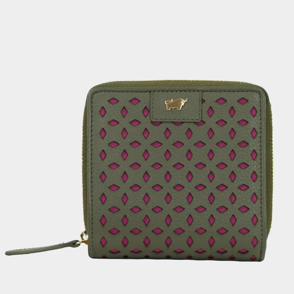 Die STELLA-Geldbörse kombiniert gekonnt mediterrane Leichtigkeit mit urbanem Chic. Gefertigt aus weichem, olivgrünem Rindleder mit feiner Narbung, überzeugt sie durch ihre angenehme Haptik und hochwertige Verarbeitung. Florale, geometrische Cut-Out-Elemente, hinterlegt mit Leder in kräftigem Fuchsia, setzen stilvoll modische Akzente und verleihen der Geldbörse ihre charakteristische Raffinesse. Das große, zweigeteilte Münzfach mit Reißverschluss, dessen formschöner Reißverschlussanfasser in Blattform das florale Design stilvoll aufgreift, bietet mit zwei integrierten Steckfächern übersichtlichen Platz für Münzen oder kleine Essentials. An der Front lässt sich die Börse per Druckknopf öffnen und offenbart sechs Kartenfächer, zwei Steckfächer sowie ein Scheinfach. Ein zusätzliches Steckfach auf der Rückseite ermöglicht schnellen Zugriff auf wichtige Dinge. Hellgoldene Metalldetails und das sandfarbene Logo-Futter runden das hochwertige Gesamtbild elegant ab.