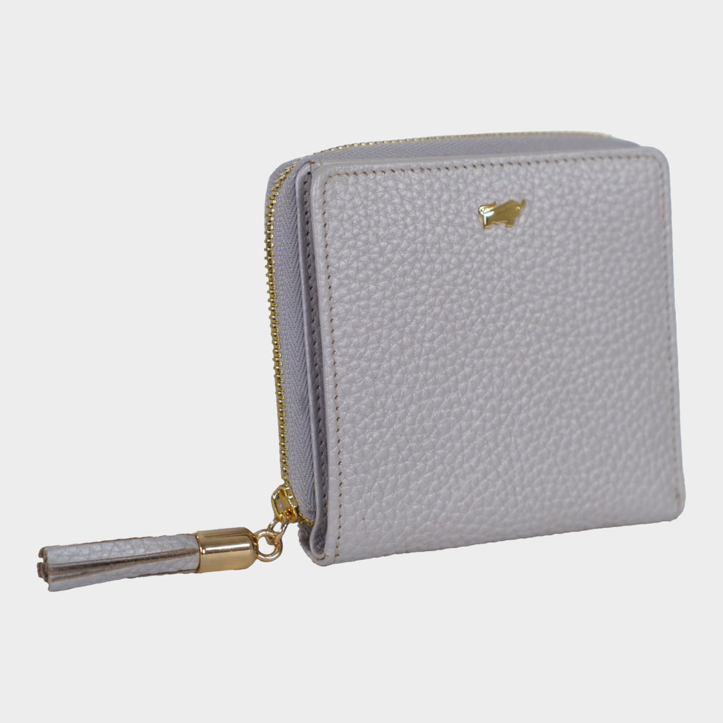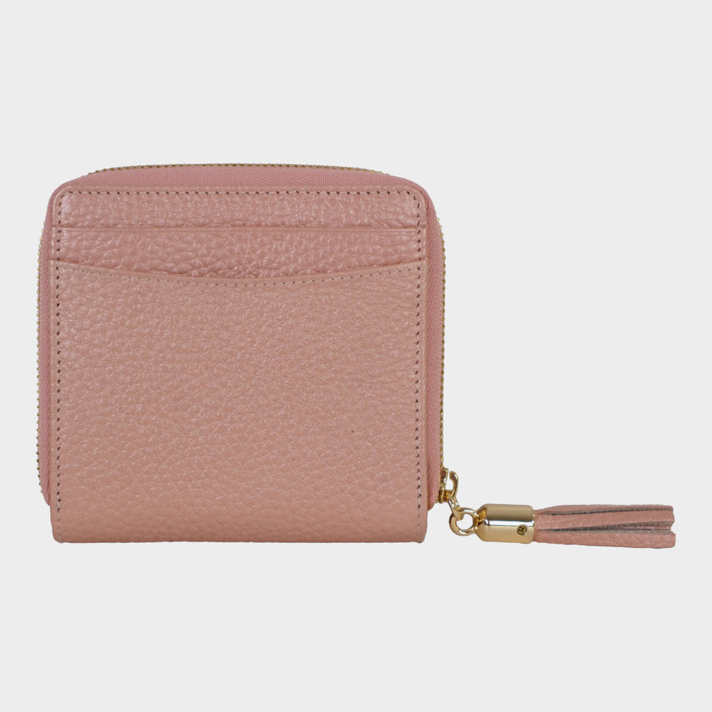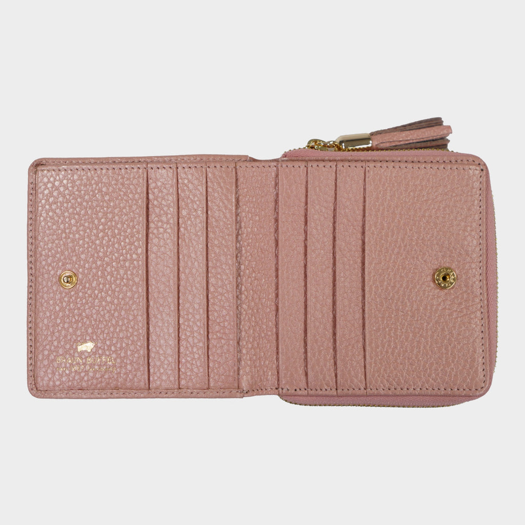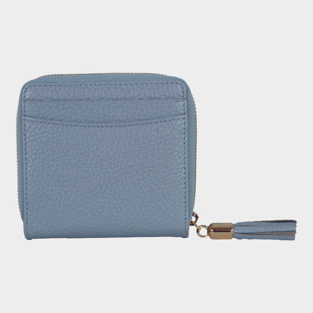 Die elegante ALESSIA-Geldbörse in kühlem Eis-Blau vereint stilvolles Design mit praktischer Funktionalität. Sie bietet ein großzügiges, zweigeteiltes Reißverschluss-Münzfach, das mit zwei integrierten Steckfächern für Münzen oder kleine Gegenstände ausgestattet ist. An der Front lässt sich die Börse bequem mit einem Druckknopfverschluss öffnen, um sechs Kartenfächer, zwei Steckfächer und ein Scheinfach zugänglich zu machen. Auf der Rückseite befinden sich zwei zusätzliche Steckfächer für schnellen Zugriff auf wichtige Dinge. Das genarbte Leder mit schimmerndem Metalliceffekt fühlt sich angenehm weich an und strahlt moderne Eleganz aus. Goldene Metallakzente, das Logoemblem, die feminine Quaste am Reißverschluss-Anfasser, sowie die goldene Innenprägung verleihen der Geldbörse einen Hauch von Luxus, während das Logofutter die Liebe zum Detail widerspiegelt. Diese Geldbörse ist die perfekte Begleitung für alle Frauen im Alltag und zu besonderen Anlässen.