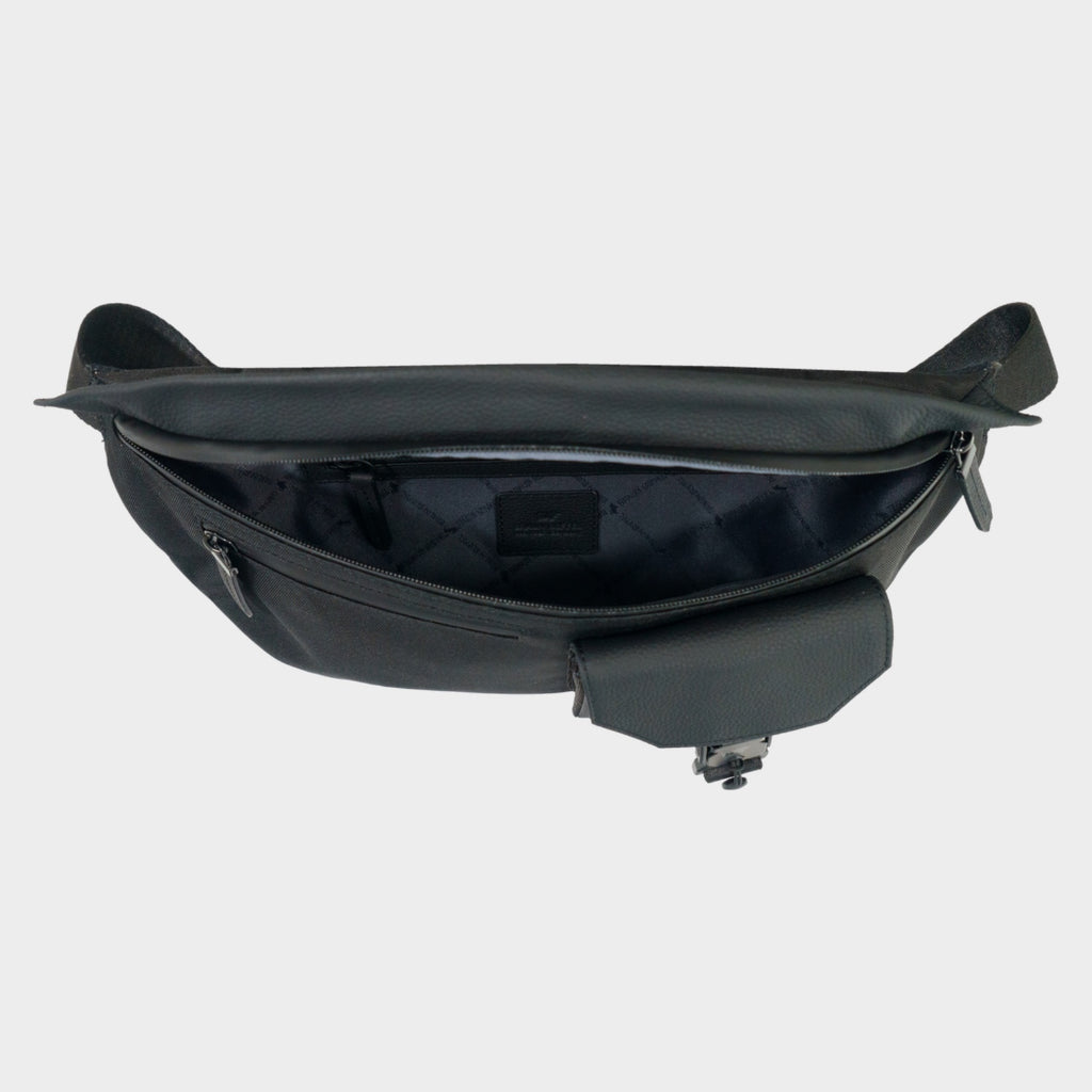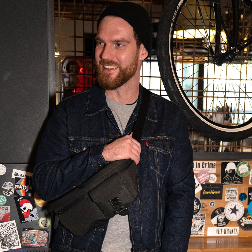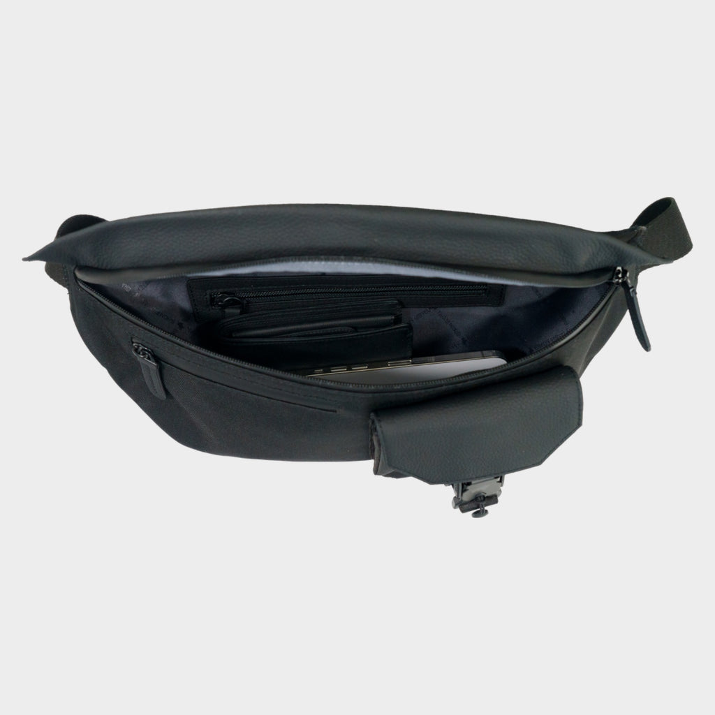 Die FINN-Crossbody Bag überzeugt mit sportlich-funktionalem Look und durchdachter Ausstattung für die Freizeit und den urbanen Alltag. Gefertigt aus robustem, wasserabweisendem Nylon, kombiniert mit Rindleder in matter, technisch anmutender Optik, vereint sie modernes Understatement mit praktischer Vielseitigkeit. Beschichtete, regendichte Reißverschlüsse schützen zuverlässig vor Feuchtigkeit und die schwarz matten Metallteile setzen stilvolle Akzente. Die markante Form im geschwungenen, dynamischen Design bietet großzügiges Volumen bei körpernaher Silhouette. Die weit zu öffnende Reißverschlussöffnung gewährt bequemen Zugriff auf das Hauptfach. Der verstellbare Schultergurt ermöglicht variable Trageoptionen – lässig quer auf Brust oder Rücken, oder seitlich nah am Körper – und lässt sich dank magnetischer Fidlock®-Schließe ebenso komfortabel und einhändig öffnen wie die Fronttasche. Diese ist mit einem Überschlag versehen und bietet schnellen Zugriff auf Wichtiges, ergänzt durch ein weiteres Reißverschlussfach daneben. Innen sorgt ein zusätzliches Reißverschlussfach an der Rückwand für sichere Aufbewahrung. Für maximalen Tragekomfort ist die Rückseite mit atmungsaktivem, gepolstertem Airmesh versehen. Ein funktionaler Begleiter mit klarer Formsprache – komfortabel unterwegs jeden Tag.