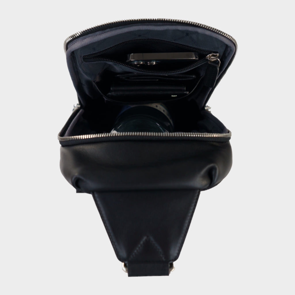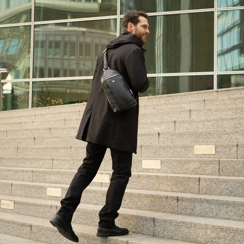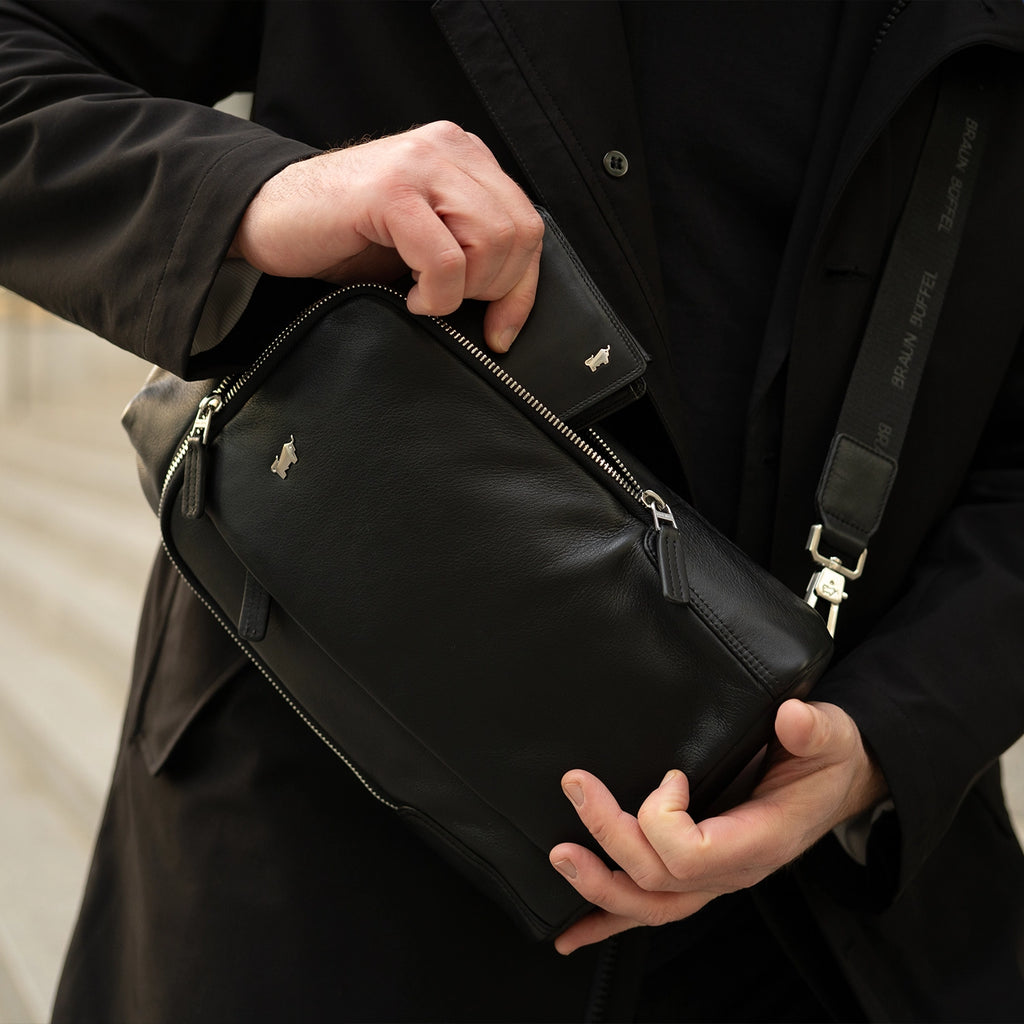 Diese moderne Sling Bag ergänzt unsere Bestseller Serie als ein idealer Begleiter für sportliche, urbane Männer, die Funktionalität und Stil im Alltag vereinen möchten. Gefertigt aus angenehm weichem, fein genarbtem Rindleder in klassischem Schwarz mit seidigem Glanz, überzeugt sie durch ihr kompaktes, körpernahes Format. Dank des verstellbaren, abnehmbaren Schultergurts mit eingewebtem Logoschriftzug kann die Tasche flexibel links oder rechts über Brust oder Rücken quer getragen werden – perfekt für unterwegs, auf Reisen oder mit dem Rad. Die gepolsterte Airmesh-Rückseite sorgt dabei für angenehmen Tragekomfort und optimale Luftzirkulation. Das weit zu öffnende Hauptfach mit silbernem Metallreißverschluss bietet schnellen Zugriff auf den Inhalt. Im Inneren sorgt ein gepolstertes Fach für die sichere Aufbewahrung kleiner Tablets oder großer Smartphones. Zwei Steckfächer, ein Reißverschlussfach und 3 Kartenfächer erleichtern die Organisation Ihrer Essentials. Die silberfarbene Metallakzente, das satinierte Logo Emblem und das anthrazitfarbene Logofutter runden den hochwertigen Look der Tasche ab, während die sportive Doppelnaht ihr eine dynamische Note verleiht.