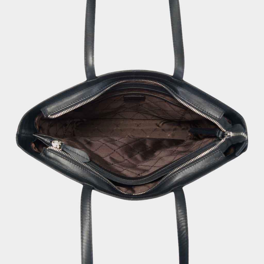 Dieser kompakte Shopper aus der HANNA CLASSIC-Serie vereint zeitlose Eleganz mit funktionaler Organisation. Gefertigt aus hochwertigem, glattem Rindleder präsentiert er sich in edlem Tiefschwarz mit seidigem Glanz. Trotz seines kompakten Formats eignet sich der Shopper ideal für den Alltag, Städtetrips oder als stilvolle Arbeitstasche. Die durchdachte Innenorganisation mit zwei großzügigen Hauptfächern, praktischen Steckfächern sowie einem Reißverschlussfach bietet ausreichend Platz für alltägliche Essentials wie Smartphone, Geldbörse oder Trinkflasche. Ein separates Reißverschluss-Mittelfach sorgt für zusätzlichen Schutz für Tablets und wichtige Unterlagen, während ein weiteres Reißverschlussfach auf der Rückseite schnellen Zugriff ermöglicht. Dezente silberfarbene Beschläge wie der abnehmbare Logoanhänger und das feine Emblem unterstreichen den eleganten Charakter des Shoppers. Dank seines leichten Gewichts lässt sich der Shopper angenehm über der Schulter oder am Arm tragen und begleitet stilvoll durch den Tag.