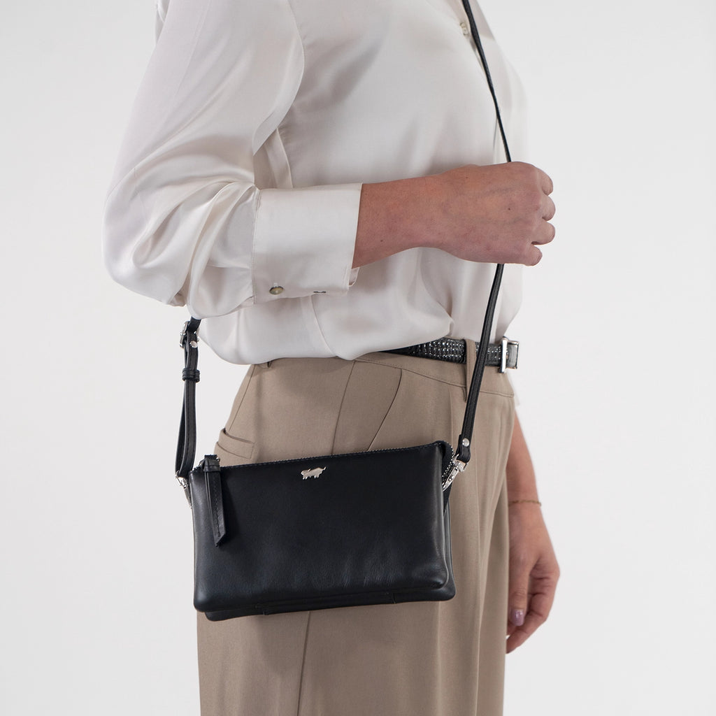 Diese handliche Umhängetasche aus der HANNA CLASSIC-Serie überzeugt mit zeitloser Eleganz und durchdachter Funktionalität. Gefertigt aus hochwertigem, glattem Rindleder präsentiert sie sich in edlem Tiefschwarz mit einem seidigen Glanz. Das reduzierte Design wird durch silberfarbene Akzente wie das dezente Logo-Emblem stilvoll ergänzt. Zwei großzügige Hauptfächer bieten ausreichend Platz für die wichtigsten Essentials des Alltags. Ein mittiges Reißverschlussfach mit integrierten Kartenfächern sorgt für zusätzliche Ordnung und sicheren Stauraum für Persönliches. Dank des abnehmbaren und verstellbaren Tragegurts lässt sich die Tasche flexibel tragen – lässig über der Schulter, praktisch als Crossbody oder elegant als Clutch. Die Umhängetasche ist damit die perfekte Wahl für Frauen, die klare Linien, einen zeitlosen Look und vielseitige Eleganz in einem kompakten Format schätzen.