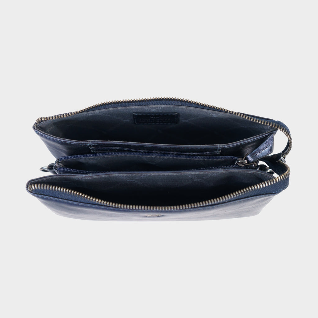 Die RUBY Umhängetasche vereint modernes Design mit funktionaler Vielseitigkeit. Dank des verstellbaren, abnehmbaren Schulterriemens kann sie auf drei Arten getragen werden: lässig über die Schulter, in der bequemen Crossbody Variante oder elegant als Clutch in der Hand. Gefertigt aus glattem Leder mit Metalliceffekt in elegantem Blau bietet sie eine angenehm weiche Haptik und ist eine stilvolle Begleiterin für die Dame sowohl im Alltag, als auch am Abend oder für festliche Anlässe. Ihr kompaktes, dennoch geräumiges Design überzeugt mit einer cleveren 3-Kammer-Aufteilung: zwei Hauptfächer, ein sicheres Reißverschluss-Mittelfach und zusätzlich gut genutzter Stauraum zwischen den Kammern, ausgestattet mit jeweils drei Steckfächern für Karten oder Dokumente. Hochwertige Details wie das Logo-Jacquard-Futter, das glänzende anthrazitfarbene Metalllogo und der formschöne Reißverschluss-Anfasser unterstreichen die edle Optik.